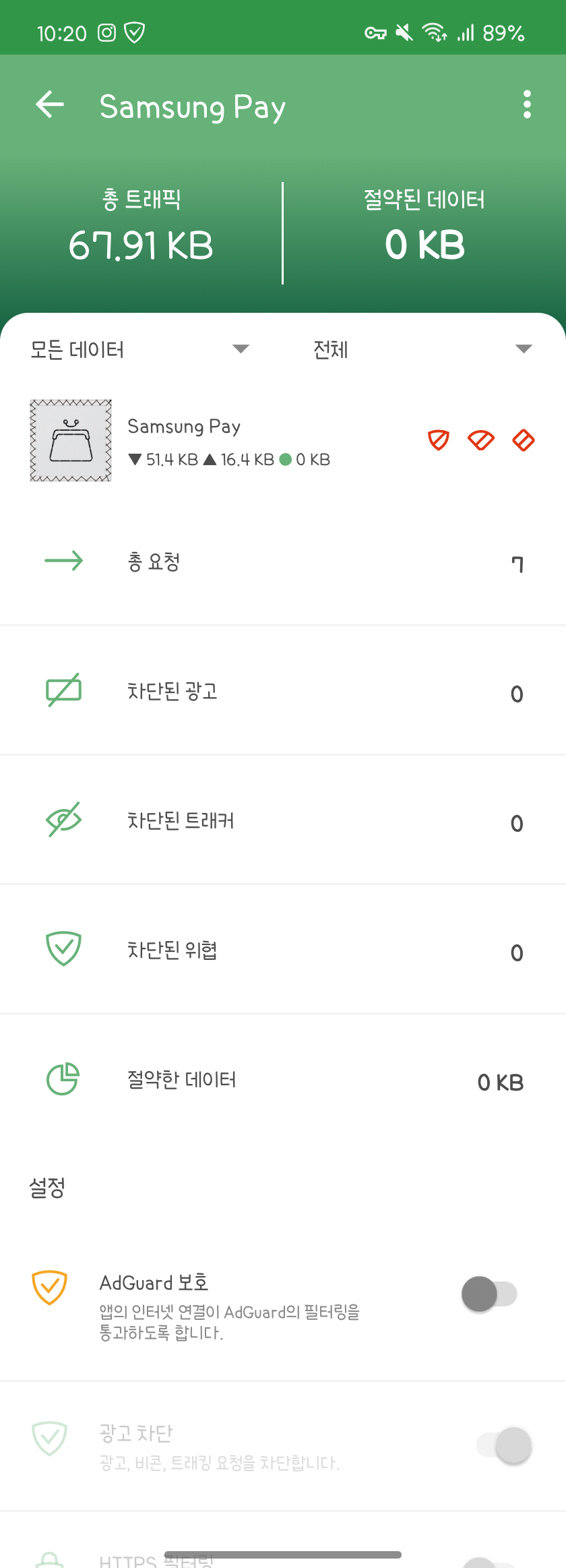 A. Adgurard의 [앱 관리] 메뉴에서 삼성페이를 찾고, [AdGuard 보호] 스위치를 꺼주시면 결제가 문제없이 잘 됩니다!
