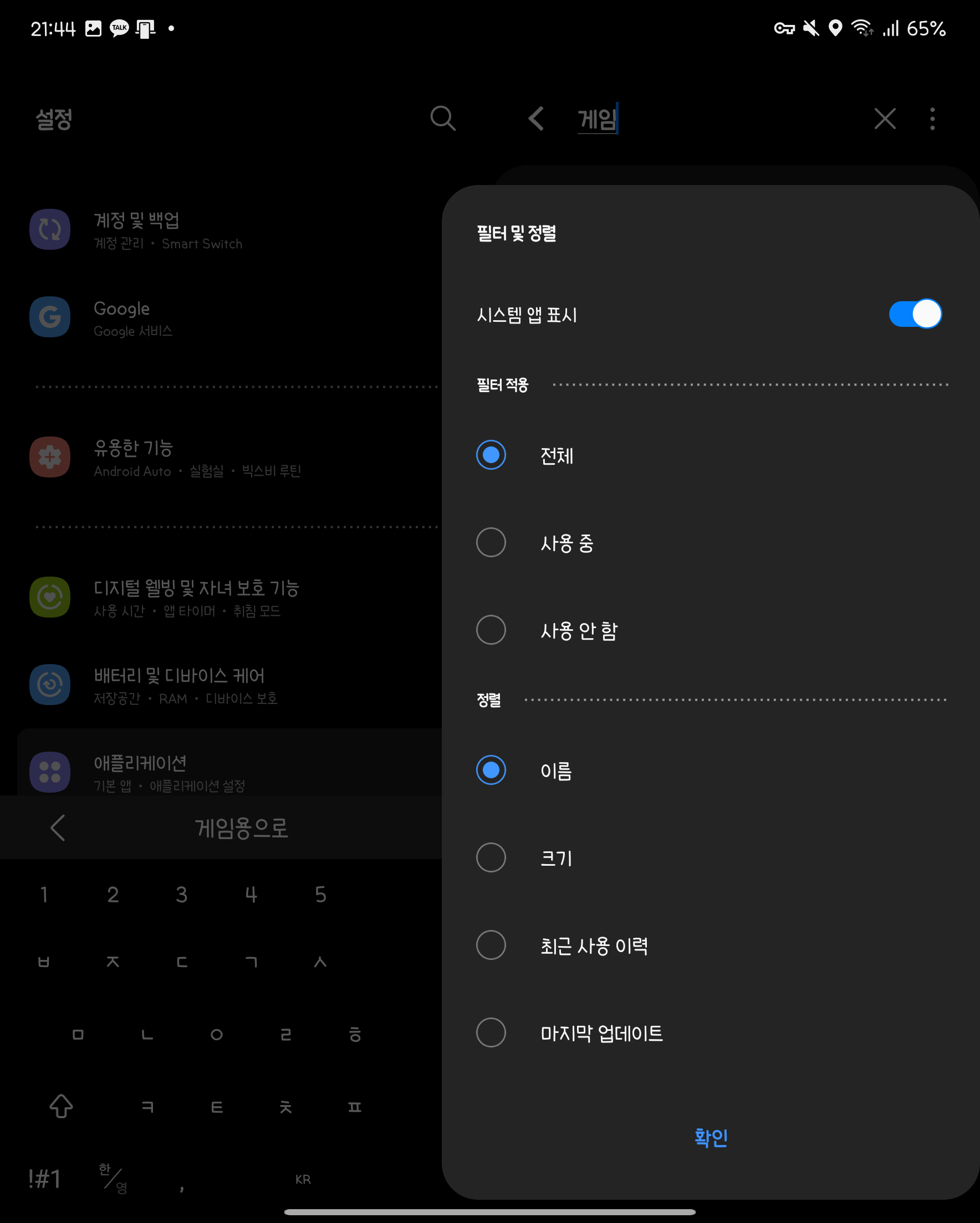 누르면 위와 같은 메뉴가 나오는데, 시스템 앱 표시 항목의 스위치를 켜주세요.